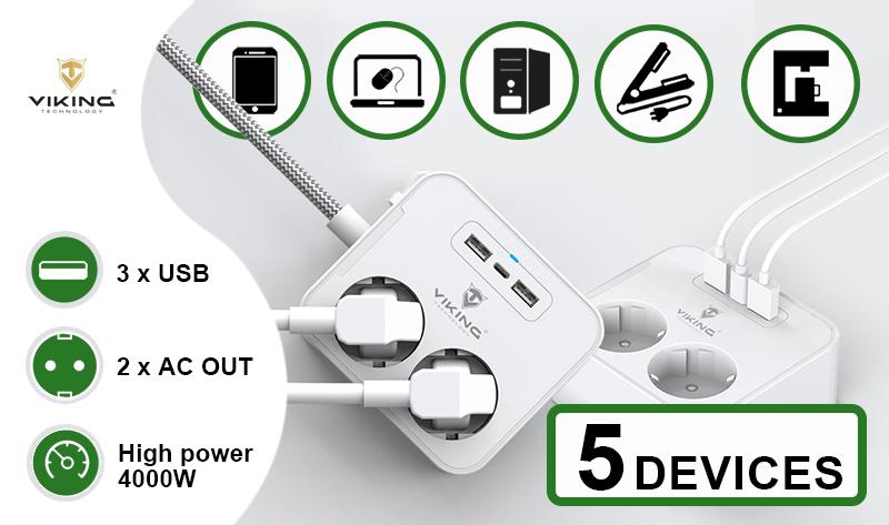 Mrežni napajalnik Viking AC23 združuje dve električni vtičnici, tri vrata USB in 1,5 m dolg podaljšek v eni kompaktni napravi, ki prihrani prostor in olajša napajanje naprav.