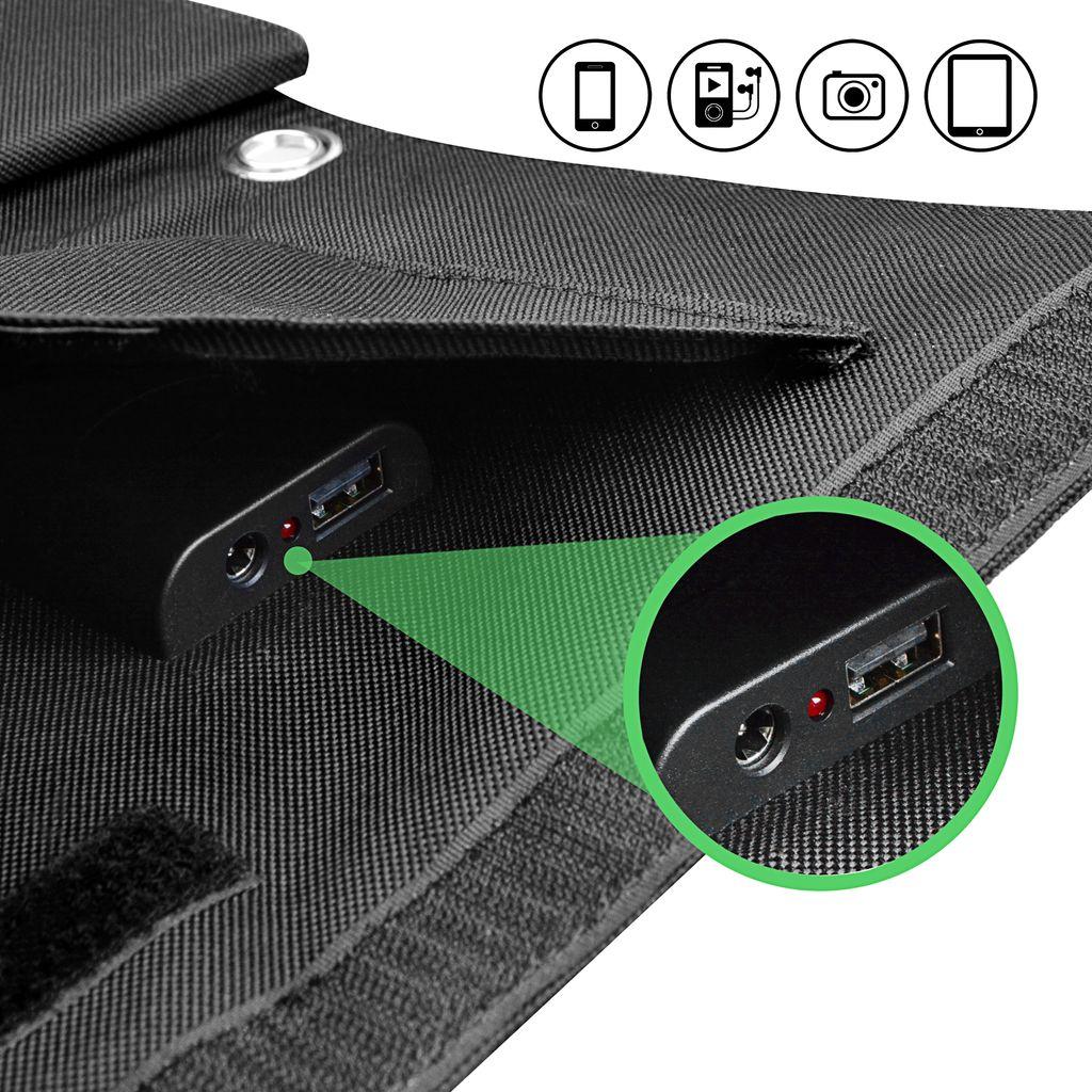 Za izhod USB imate na voljo dovolj energije za vse naprave do največ 5 V/2,4 A. Z izhodom za enosmerni tok lahko polnite elektroniko do 19 V/1,5 A. Sončno ploščo lahko uporabljate pri vseh dejavnostih na prostem. Uporabite le ustrezen USB reduktor za vaše naprave.